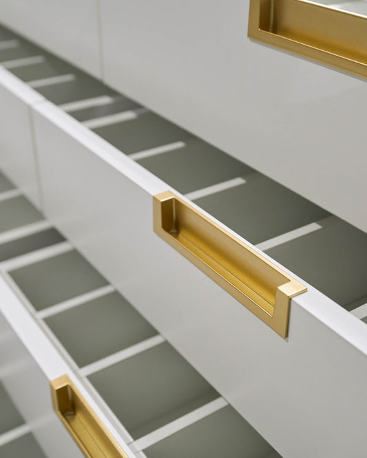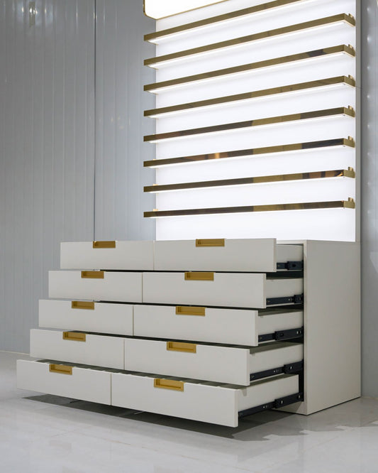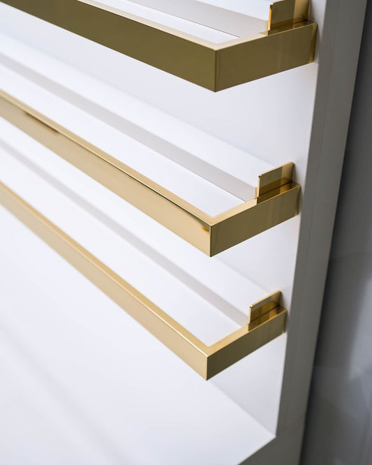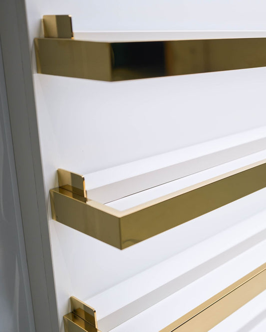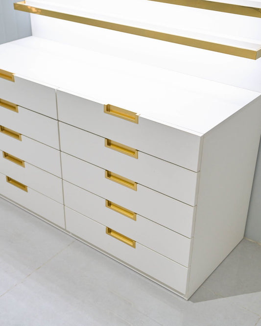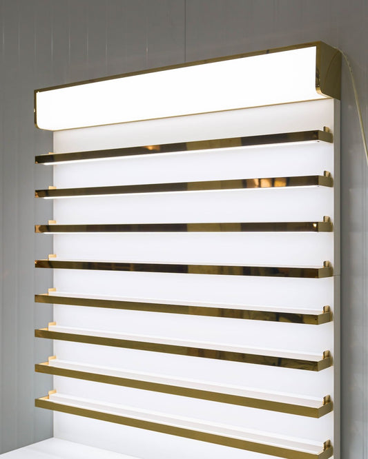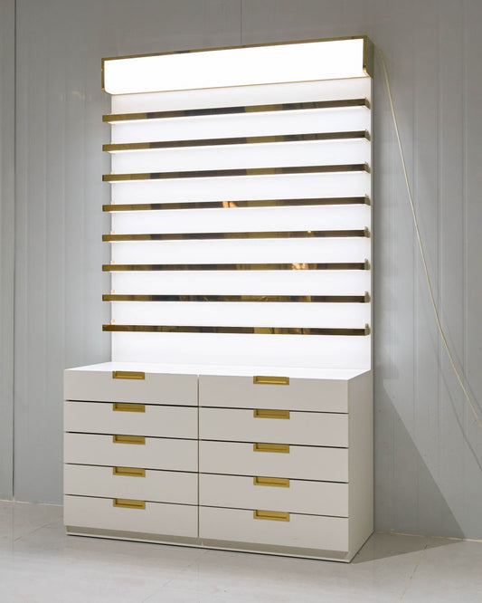 🔥Kệ sơn có đèn LED từng hàng & light box. Điểm nhấn viền gold stainless steel sắc sảo. Phần hộc kéo có tay nắm gold stainless steel âm tủ gọn gàng.